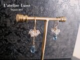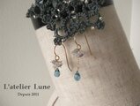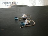 海のような青緑色の美しいロンドンブルートパーズのドロップ石を、白から青紫系のボタン石とあわせました。石は小ぶりですが、深い色で透明感があり美しいです。片方にチェーンをつけて、アシンメトリーな長さに仕上げました。