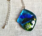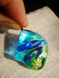 ブルーとグリーンのクリアガラスに大中小のミルフィオリ(金太郎飴状のガラス)が溶け込んでいます。