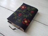 ネイビーの綿ツイルにサイズいっぱいに花と葉っぱを刺繍した文庫本ブックカバーです。