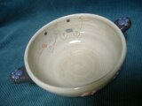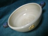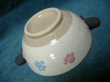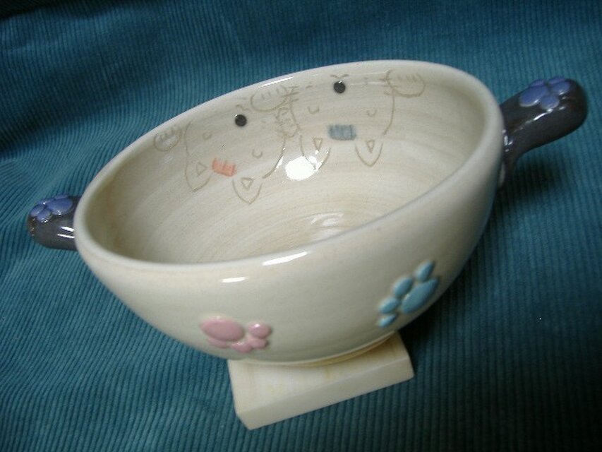 陶土の赤土と並土をブレンドした土でロクロ成形し、白化粧土を掛け、肉球付き手を2箇所に取り付け、カラー粘土で肉球を貼り付け、透明釉掛け後23時間かけて1240度で焼き上げました。