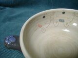 カラー肉球が付いた黒い手が両側にある、持ちやすくて可愛いボウルです。外側には黄色、水色、ピンクの肉球があり、内側には可愛い2匹の猫がのぞき見しています。