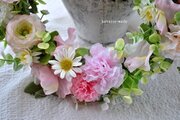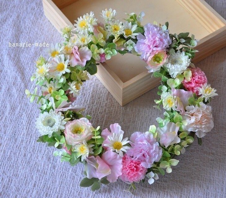 リース資材:アーティフィシャルフラワー(デイジー・カーネーション・ヘリクリサム・ラナンキュラス・スイトピー・ユーカリ・グリーン、など)、その他(リボン飾り)
