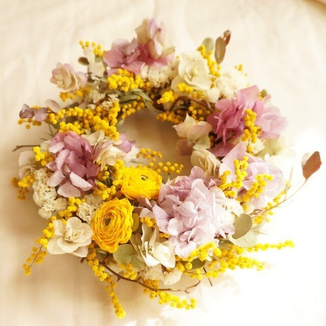 春らしい明るいミモザとほんのり紫が載ったオレガノのwreathです。