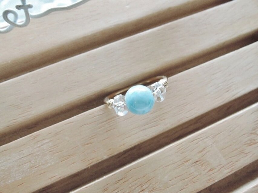 ラリマー(7~8㎜丸玉:AAAAA)、水晶ボタンカット(AAA)、指輪、ワイヤー。