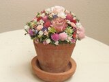 テラコッタのナチュラルな植木鉢に春のお花畑です