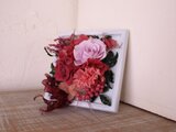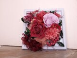 ナチュラルな雰囲気の白い木の額に、プリザーブドフラワーをこんもりとアレンジした額アレンジです。
