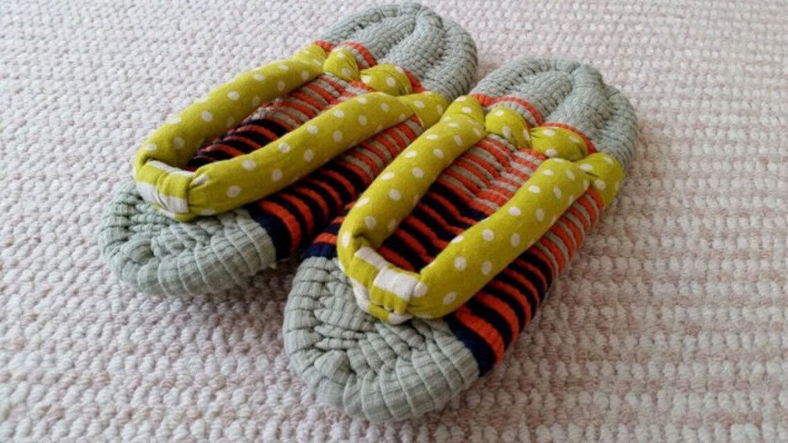 鼻緒がきつかったり、緩んだら布ぞうりの裏で鼻緒を結びなおしてください。