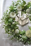ベージュやグレージュのニュアンスカラーが美しい、ボリューム感のあるスワッグです。白バラ、ドライフラワー風の紅バラをアクセントにどこか時間を超えた幻想的な雰囲気も感じられてとても心惹かれます。 また、スワッグの向きや花器に応じた飾り方を提案して下さっているので、これから色々な表情を見つけて行ければと思います。今回も素敵な作品をありがとうございました。