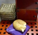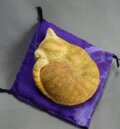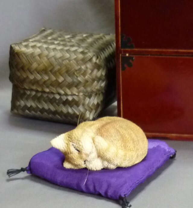 軽量粘土で作った猫さんを白い正絹縮緬でくるみ茶トラ模様をつけました。思い切りくるりと丸まってアンモナイトのようです。