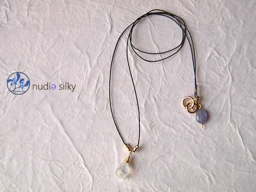 細い木五倍子染めシルク糸と表情のあるブルームーンストーンの繊細な印象の