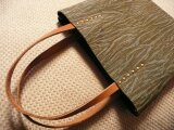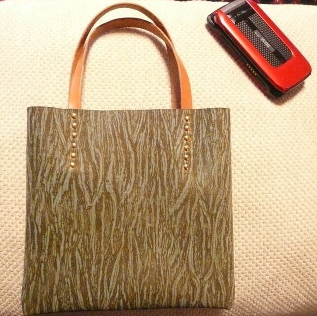 持ち手は本体に金色の極小カシメを1列に取り付けました。強度はそれなりにあります。