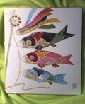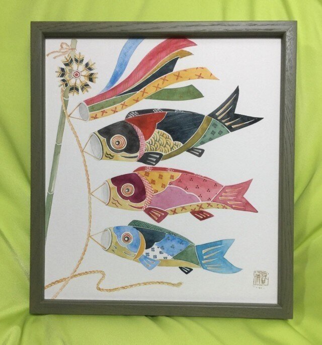 色紙に墨と顔彩で描いた鯉のぼりです。 モスグリーンの木製額(29×26㎝)入り (表面はアクリル板です)