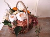 ナチュラルな雰囲気のカゴに、プリザーブドフラワーを寄せ植え風にアレンジしました。