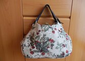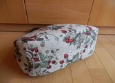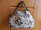 大人っぽいコットンリネンのいちごプリントで両面の大きなあおりポケットが便利ながま口バッグをつくりました。