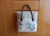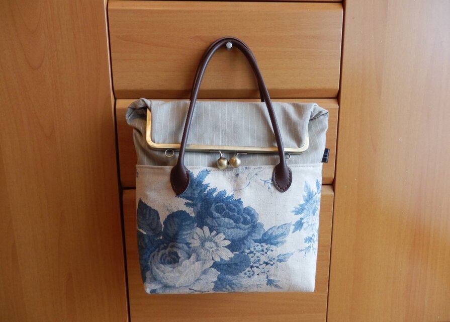 アンティークなコットンリネンのオールドローズのプリントで両面の大きなあおりポケットが便利な大き目のがま口トートバッグをつくりました。