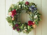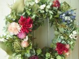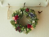 真っ赤なカーネーションをポイントに、いろんな花材を入れたリースです。