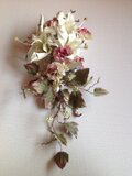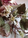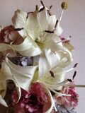 白いユリとカーネーション、紫陽花を蔦の枝でアレンジしています。