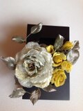 引き立たせています。卓上にしても使えます。薔薇の花弁は一枚づつ染め分けて趣きのある色合いに染め手作りの良さがでています。花芯は金ペップが使っています。