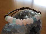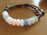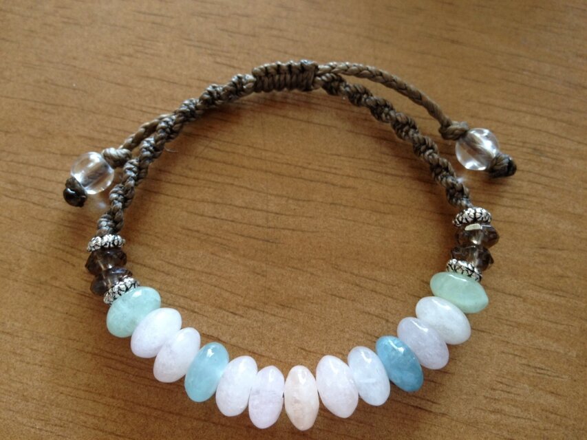 モルガナイトのビーズをメインに、ベリルのボタンビーズでマクラメブレスに仕上げました。