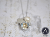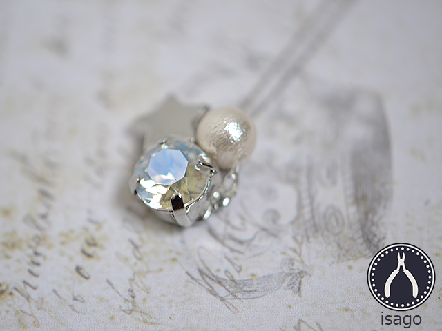 スワロフスキー、コットンパール、メタルパーツによるペンダントになります。