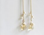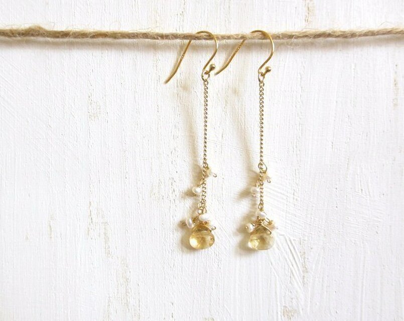 シトリンと天然淡水パールのピアスです。ゆらゆら揺れるロングピアスです。