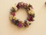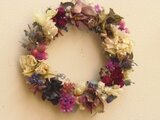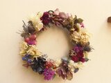 こちらのリースはドライフラワー素材を多く使用しています。時間の経過とともに3か月ほど経てば退色が進みます。花びらや葉や実も徐々にハラハラと落ちてきます。
