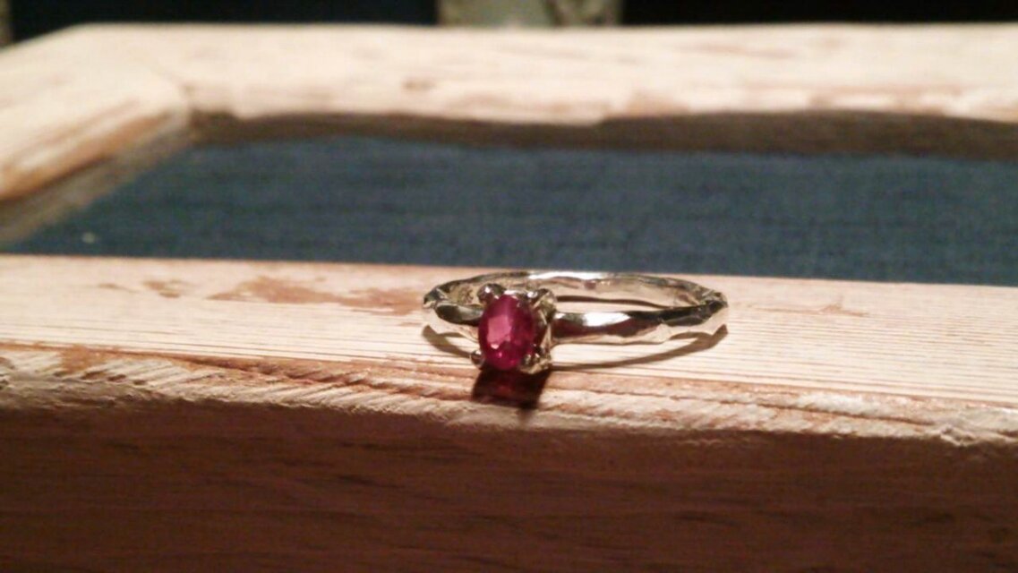 打ち出した感のあるシンプルなリングのつくりに鮮やかなルビーの色がとても映えます。