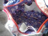 デニムの生地に菊のテキスタイルの和っぽい赤い生地を合わせました。
