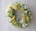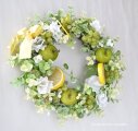 リース資材:アーティフィシャルフラワー(青リンゴ・スイトピー・レモンスライス・グリーンラズベリー・グリーンベリー・ハートカズラ・グリーンのベリー・ユーカリ、など)、その他(リボン飾り→取り外しできます)
