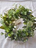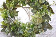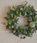 リース資材:アーティフィシャルフラワー(アリウム・フウセンポピー・ホップ・スマイラックス・フィットニア、など)、その他(山苔・麻リボン飾り)