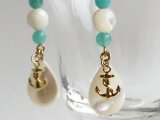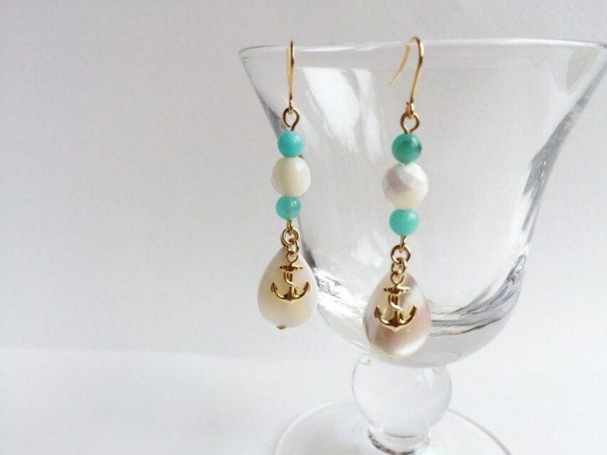 乳白色のシェル(マザー・オブ・パール)に、小さな錨(イカリ)のチャームが揺れる、マリンなイメージのピアスです。