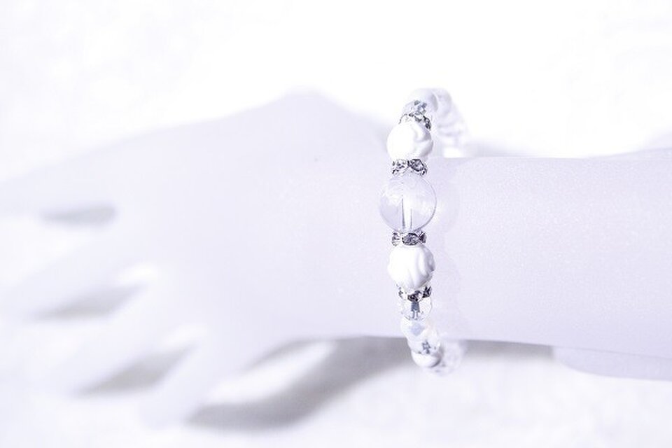 やさしい色あいのマザーオブパールと薔薇の彫刻の入ったホワイトオニキスを使用してゴムブレスレットを作りました。