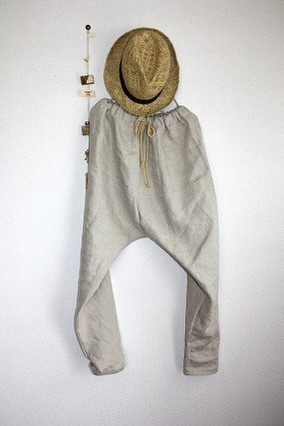 ひんやり冷たくサラリとした肌触りのリネン100%素材のサルエルパンツです。
