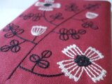 やや渋めのローズピンクの薄手の綿混チノクロスに同色で花刺繍をした新書サイズのブックカバーです。