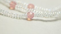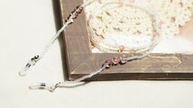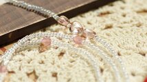 透明感あるピンクのハートとところどころにミルキーピンクのビーズを散りばめ優しく、可愛い眼鏡ストラップに仕上げました。