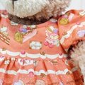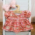 スイートなサーモンピンク スイーツ柄ワンピースとリボンの2点セット パフスリーブ