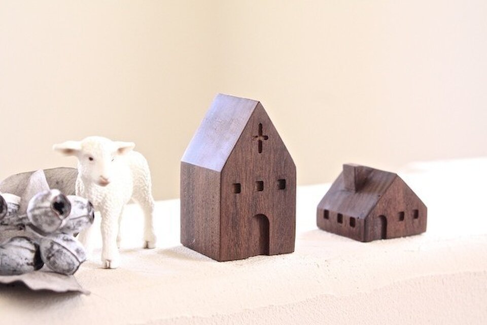 ヨーロッパの民家をモチーフに、無垢の木から削りだして小さな木の家を作りました。