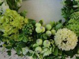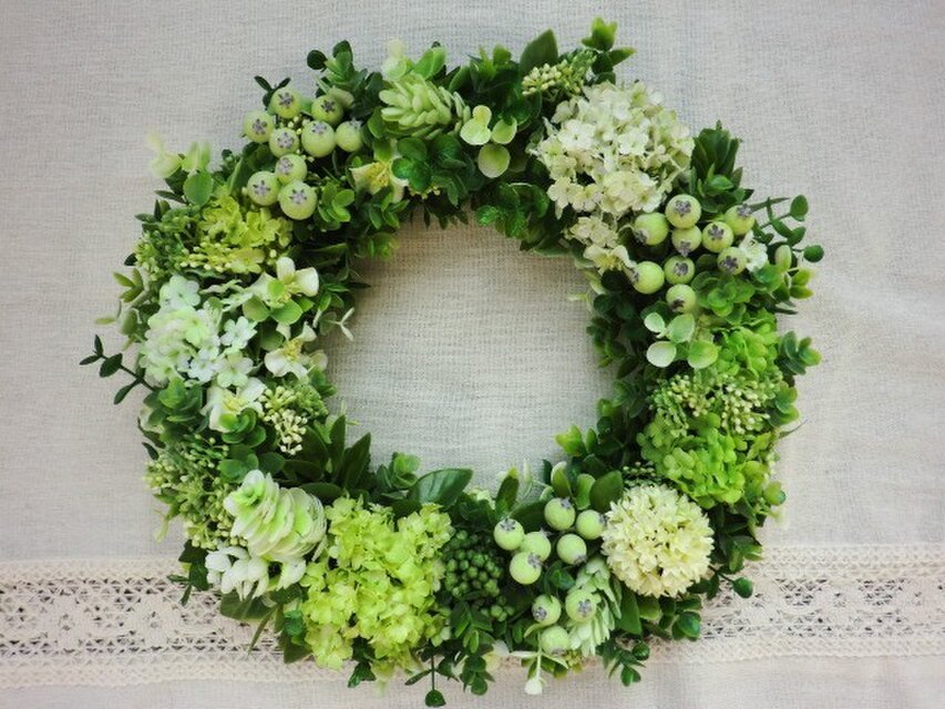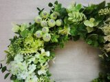 ホワイトやグリーンのビバーナムをメインにして爽やかなライトグリーンのユーカリやベリーなどでまとめたリースです。初夏のフレッシュな香りが漂ってきそうな雰囲気でさわやかさ満点のリースです。夏にかけてこのリースを飾って今年の夏を涼やかに楽しんで頂きたいです。全てアーティフィシャルなので室内外ともに飾れます(直径32㎝、高さ9㎝)。