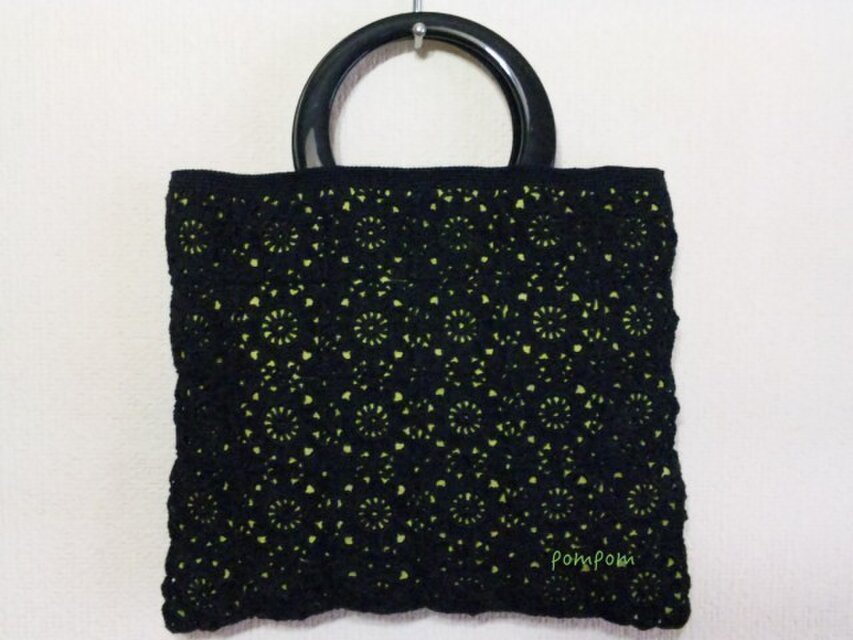 *黒のモチーフを繋いで編んだバッグで、編み目から見える