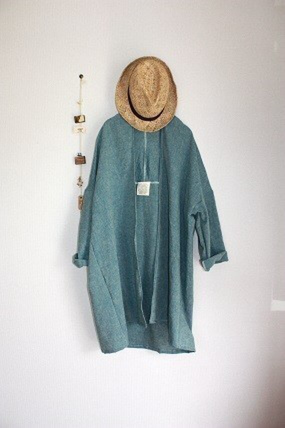 ベージュとアンティークグリーンの、何とも言いえないナチュラル感のあるお色のシャツ感覚で着れるコットンリネンです。