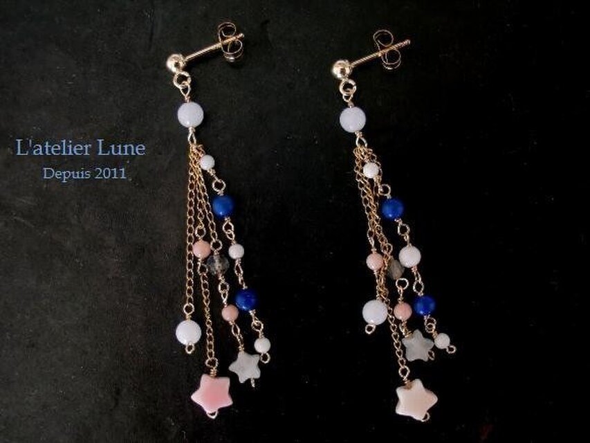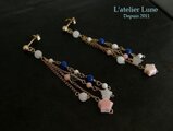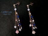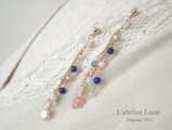 ”吹き流し”のイメージで作ったピアスです。シェルの星やラピスラズリ、小さなコーラルなど可愛らしいものをチェーンで沢山ぶら下げました。耳元で吹き流しのようにゆらゆら揺れて可愛らしいピアスです。