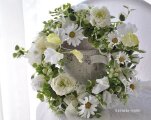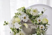 ベージュやグレージュのニュアンスカラーが美しい、ボリューム感のあるスワッグです。白バラ、ドライフラワー風の紅バラをアクセントにどこか時間を超えた幻想的な雰囲気も感じられてとても心惹かれます。 また、スワッグの向きや花器に応じた飾り方を提案して下さっているので、これから色々な表情を見つけて行ければと思います。今回も素敵な作品をありがとうございました。