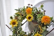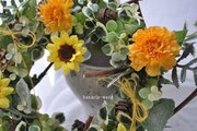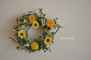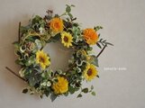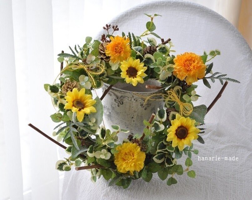 リース資材:アーティフィシャルフラワー(ひまわり・マリーゴールド・ブラウンの実・ユーカリ・プミラ、など)、自然素材(松かさ・メタセコイア・小枝、など)、その他(黄色の麻紐飾り→取り外し出来ます)