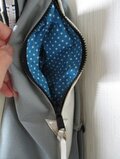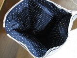 裏地はしっかりした濃いネイビードット柄シャンタンレーヨンです。ポケットは明るいブルーのドット柄です。