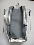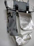 最強ナイロン、コーデュラのグレー(ポイントに白使っています)と箔プリントの山羊革(シルバーレザー)で作ったリュックです。