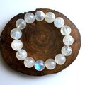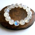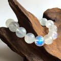 ほとんどの石はムーンストーンに特有の泡状インクルージョンを含みますが、白~半透明の地色に、神秘的なブルーやホワイトの輝き(ペリテリズム)が見られる、とても美しいブレスレットです。