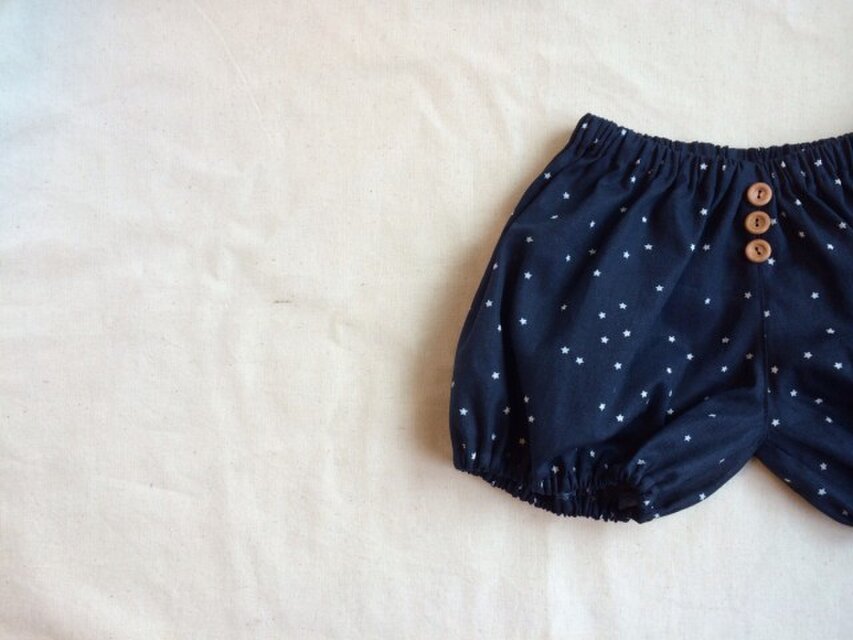 生地量をたっぷりと使い、コロンとしたかわいい形になっています。サイドを少しすっきりさせたかぼちゃパンツもありますので、あわせてご覧ください。