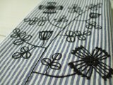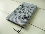 青と白のストライプのサッカー生地(弱めのシボです)に黒で花刺繍をした新書本サイズのブックカバーです。