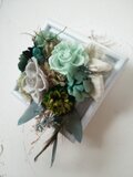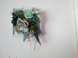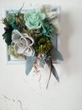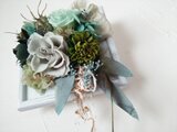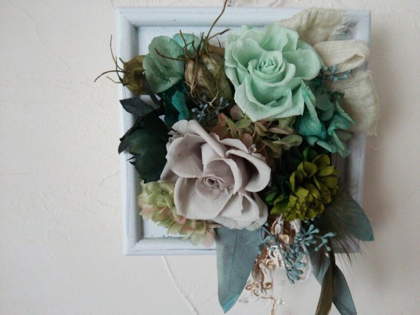 グレーグリーンのローズやダークグリーンのダリアにミントグリーンのローズ、自家製加工のクリスマスローズや草木染めの裂き布、カーキ色の羽根など、大好きなグリーンの素材をたぷっり使って、森の一部を切り取ったような雰囲気の額アレンジです。グリーンは年中飾って頂け、おすすめです。