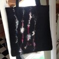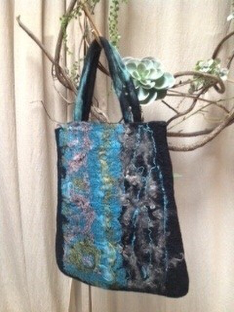 トートバッグのような形。高さ40c巾35c.ベルト長さ30c 裏、表が違うデザインです。裏地と内側ポケット付き。ベースは黒いフェルトに絹地をコラージュしたもの。